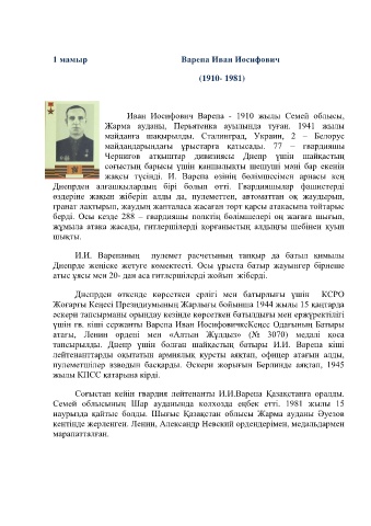 тапсырылды. Днепр үшін болған шайқастың батыры И.И. Варепа кіші